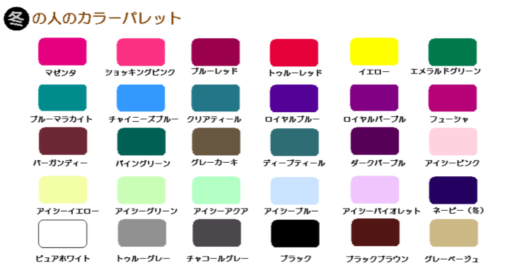 パーソナルカラーが冬の人はこのカラーパレットを参考にして下さい。
